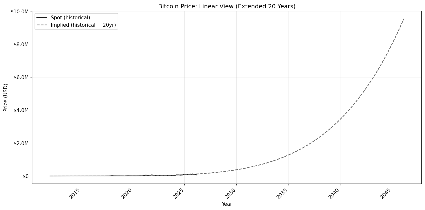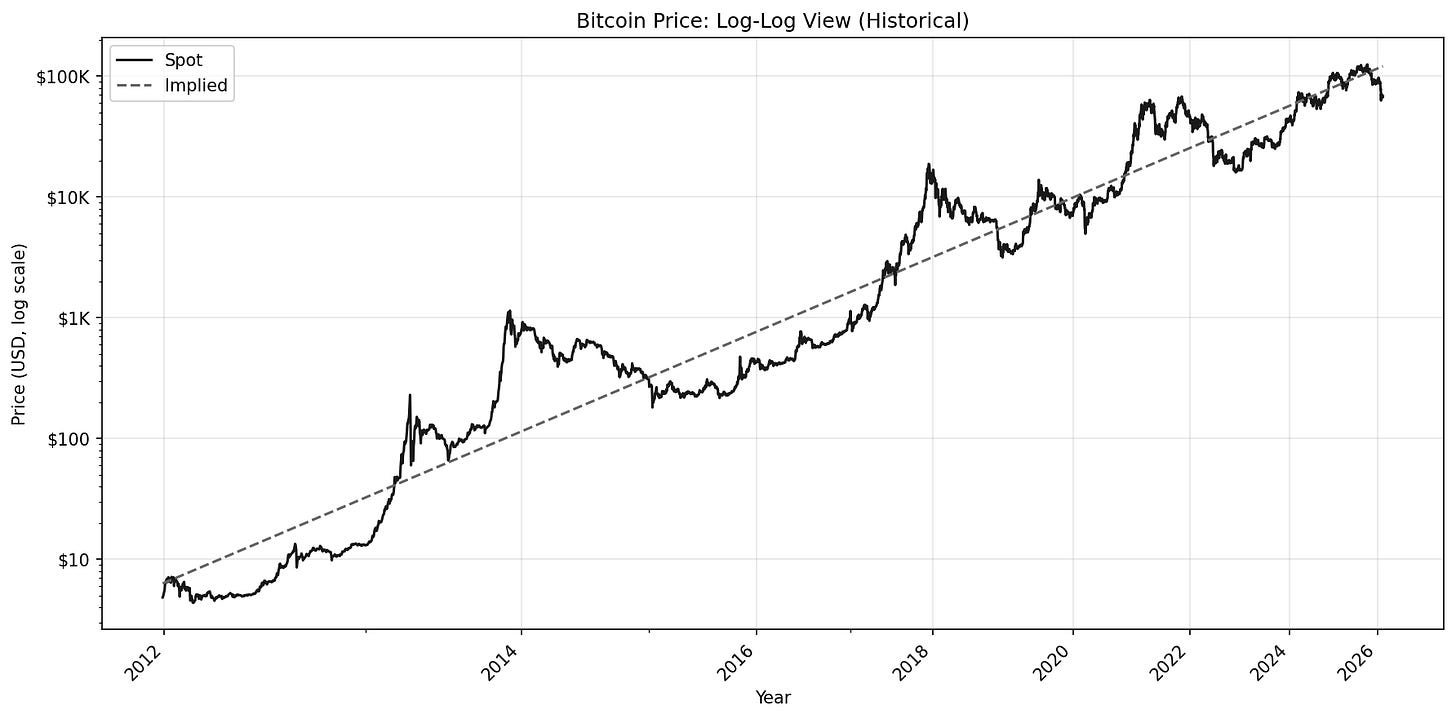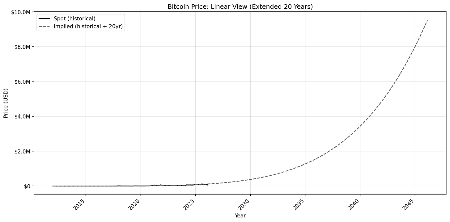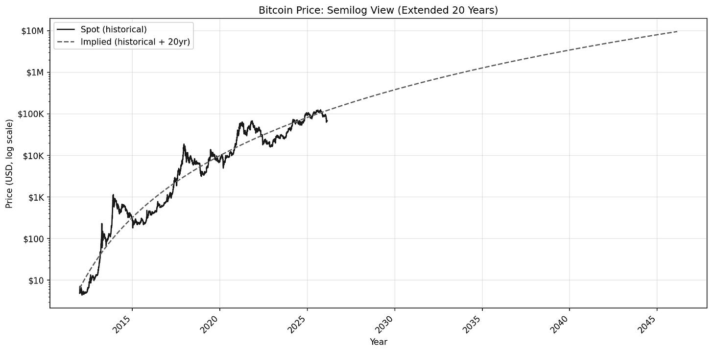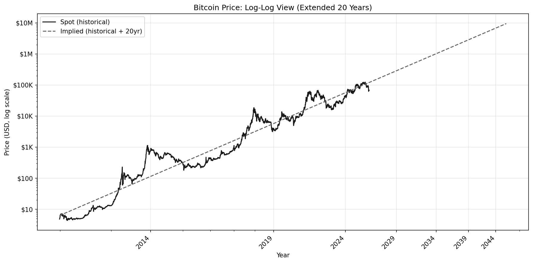 With the slope known, we can extend time out to understand where the implied price may fall in the future. To be clear, this isn’t a prediction so much as using geometry of the power law itself to project forward.