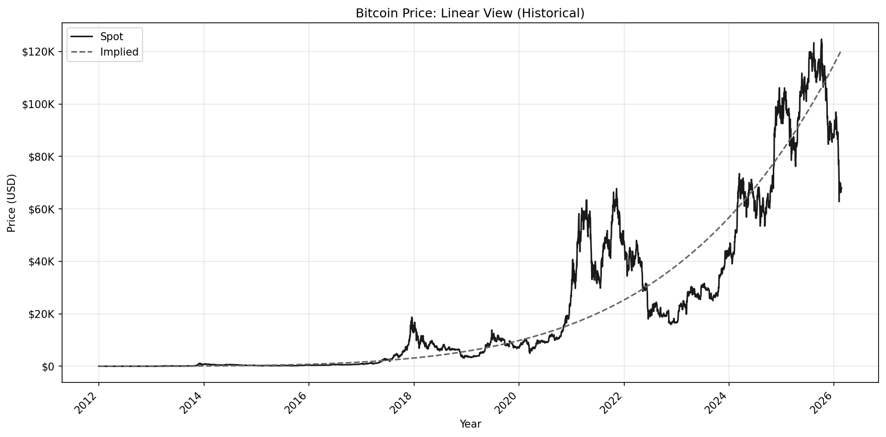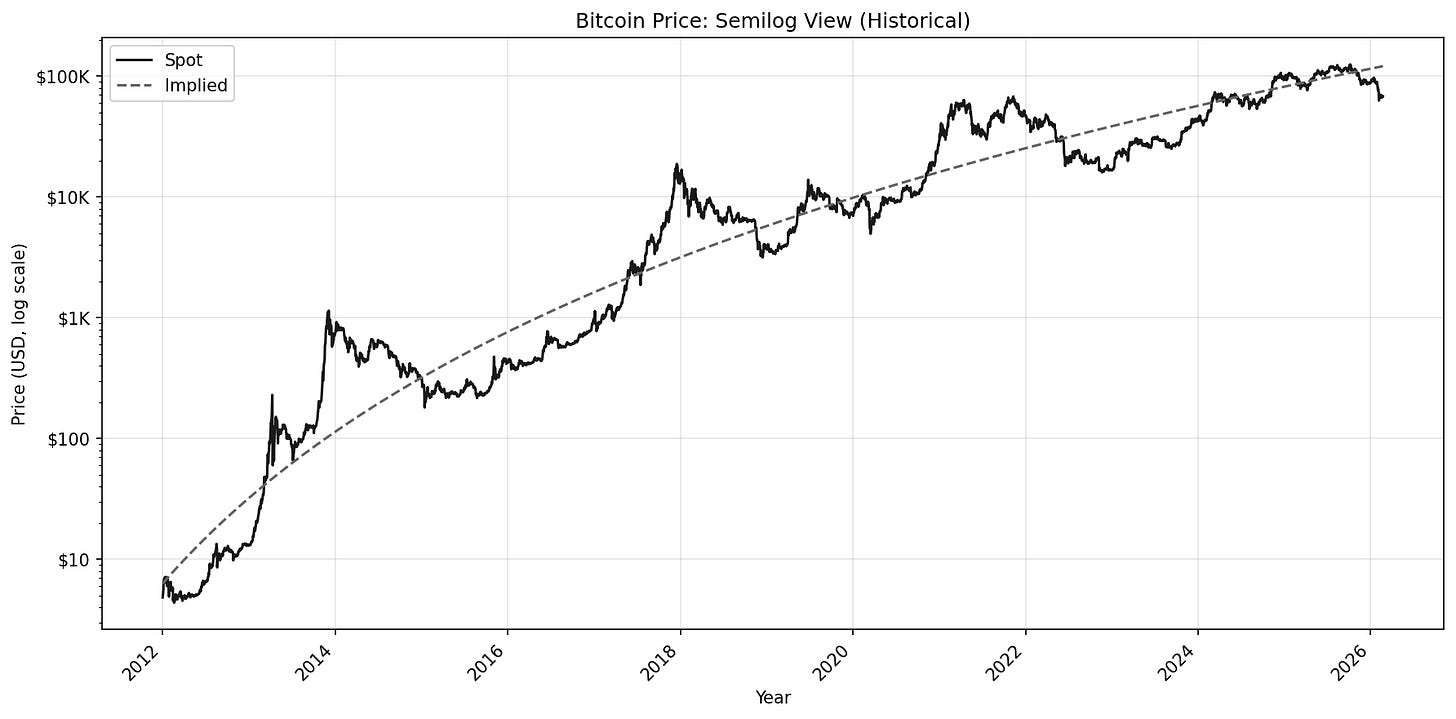 In the semi-log chart, with Price now in log form, we have a much better idea of those earlier years. Growth appears proportional, it oscillates around the Implied price, and travels in a channel. Additionally, this chart does a great job at showing Bitcoin’s decaying growth, which we observe as the Implied slope gradually bends downward.