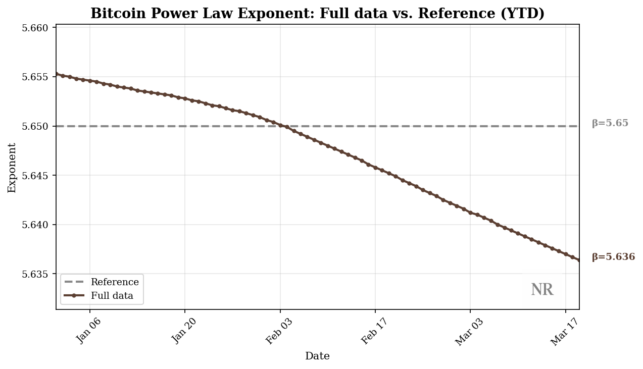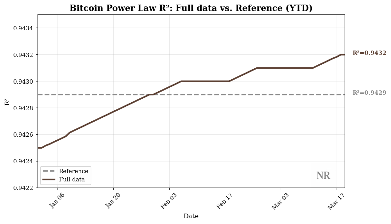 Through a power‑law lens, Bitcoin remains under the 25th price percentile and 43.67% below its implied price — with the underlying structure still intact.