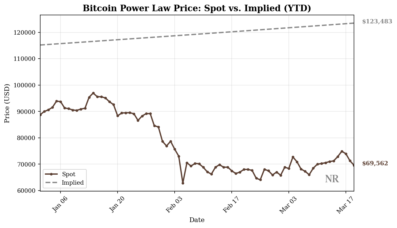 Bitcoin is trading 43.67% below its implied price, in accordance with the power law. Our first pullback below $70,000 since early March.