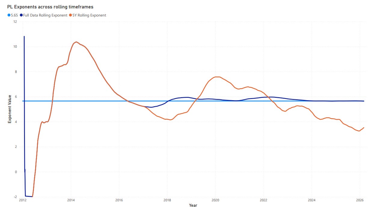 The 5Y exponent calculation is done over a rolling window of 1,825 days. Each day, the oldest day drops out and the newest day enters. For the exponent to recover toward the long-term structural trend, the data leaving the window must be replaced by data that adheres better to the power law.