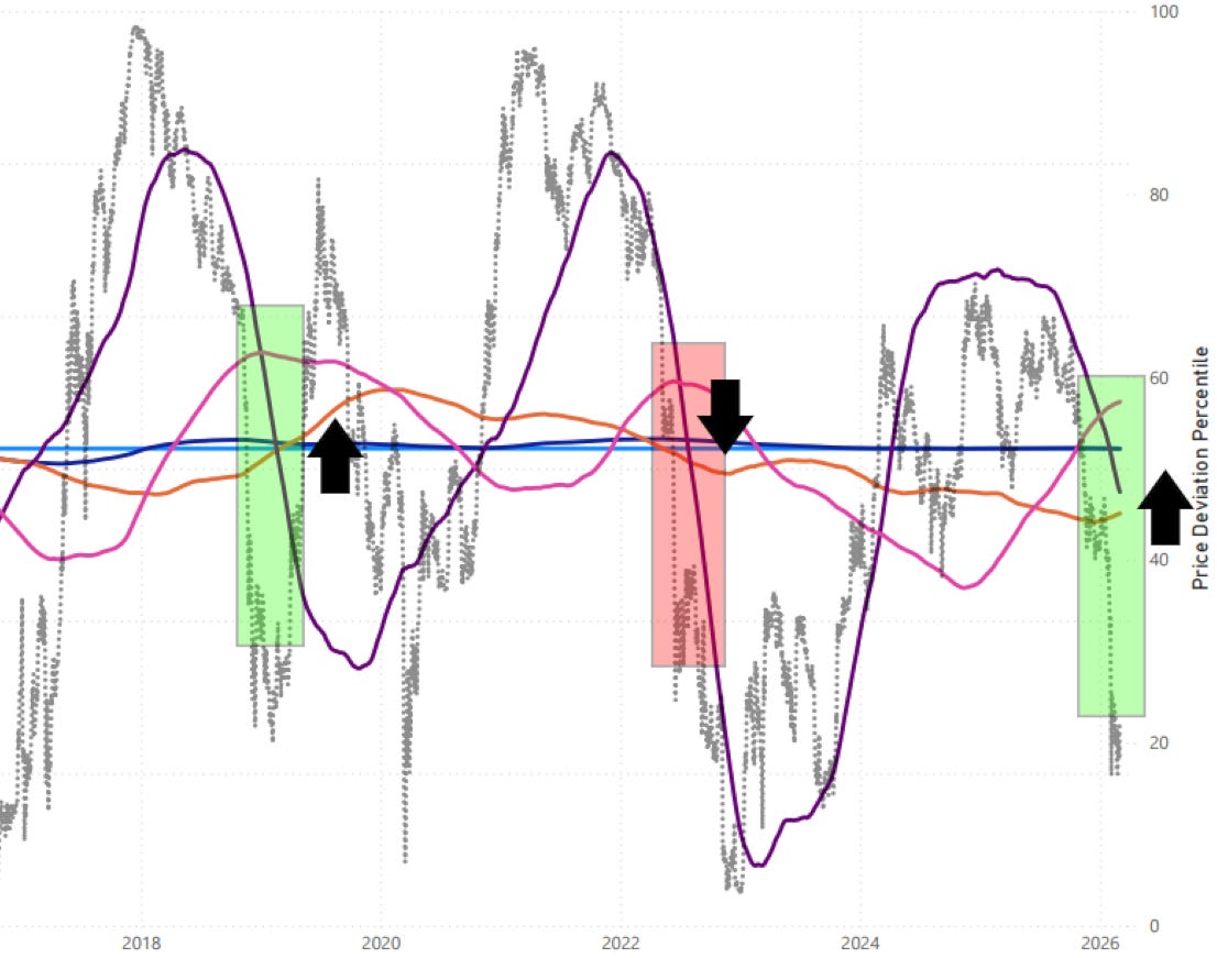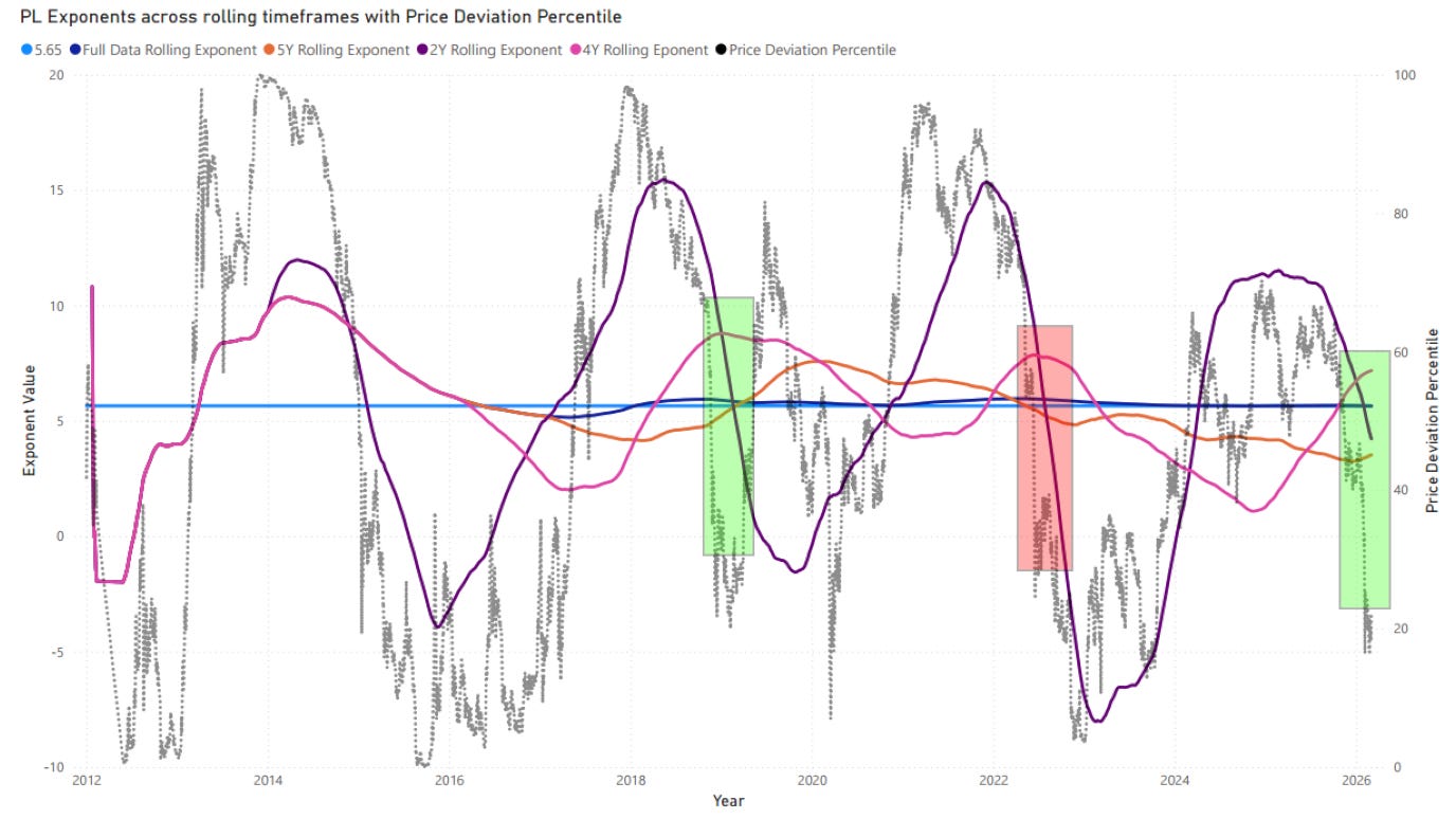 The 2022 low is still in the window. When it rolls out, we are swapping very weak price action for whatever comes next. If price from here trades at or above the power-law line, the new data will “pull” the exponent calculation up. If price stays far below implied, the new data is still weak, and recovery is slower.