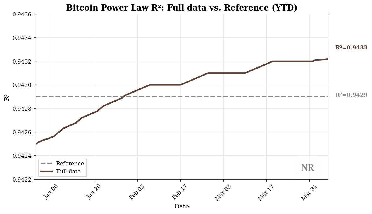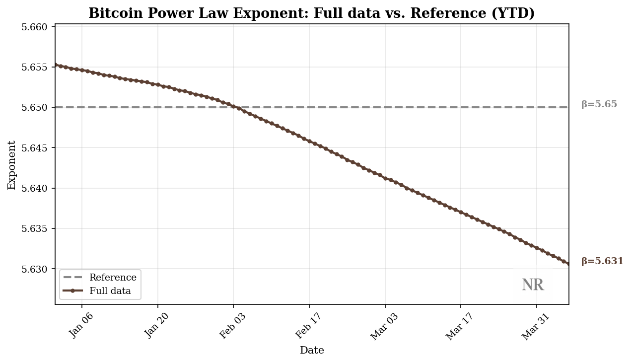 The current exponent and R² values indicate that the power law remains intact. They suggest that the long-term relationship is still present, even as spot trades are undervalued.