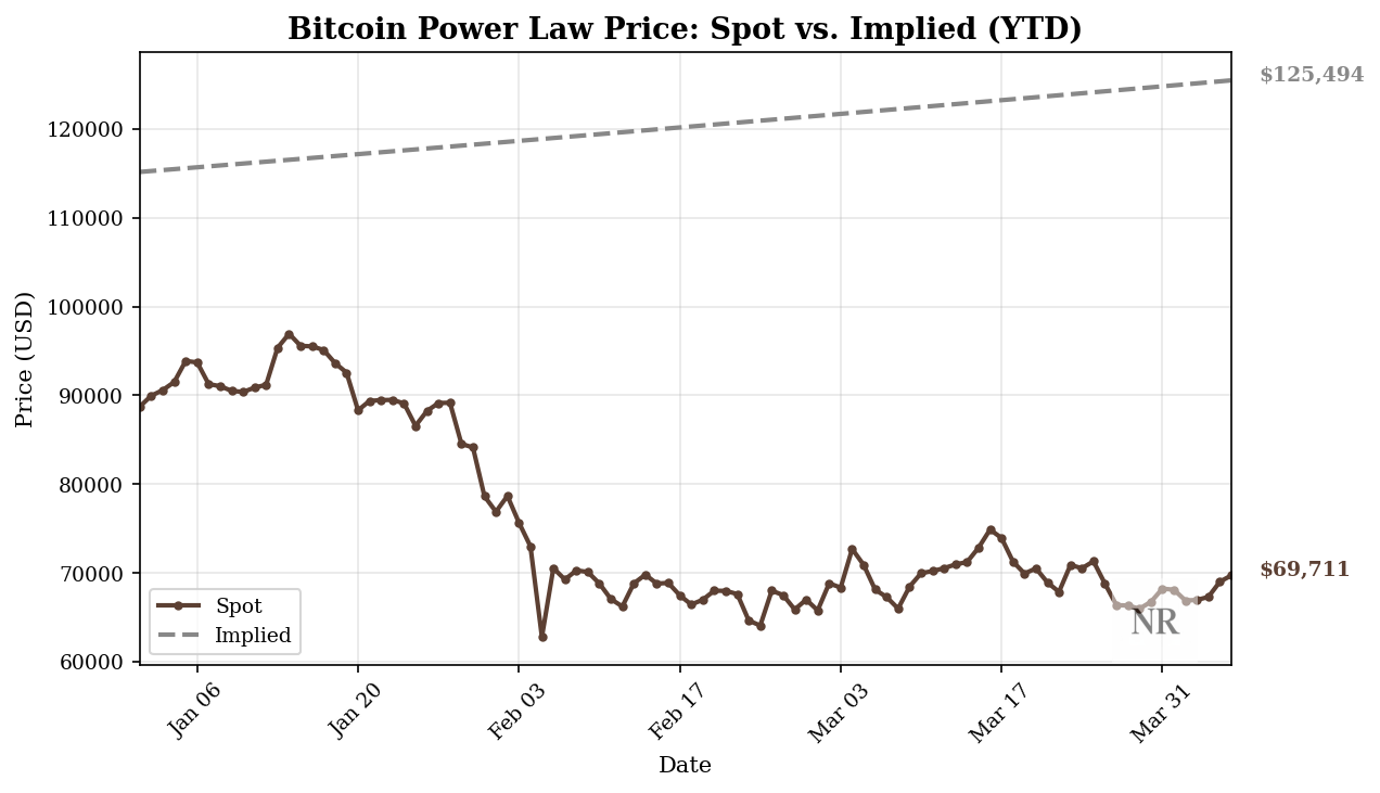 April 6, 2026 @ $69,720 (p20) Bitcoin is meaningfully discounted relative to its implied path. Followers of our research will note that we’ve been in this regime since early February, when we warned “we’ve been here before and we don’t expect to leave quickly.”
