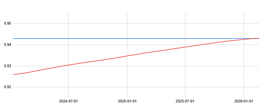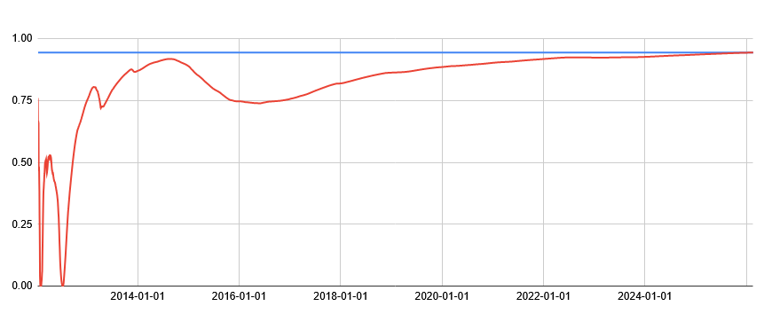 Zoom out, and those wiggles compress. The exponent and r² lines sit almost on top of their baselines. The long-term picture is remarkably straight.
