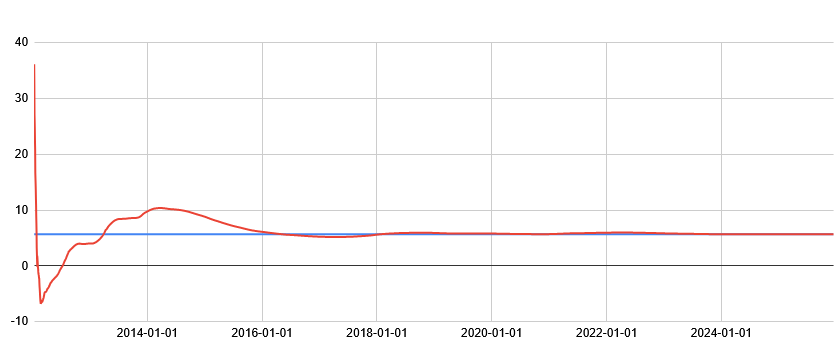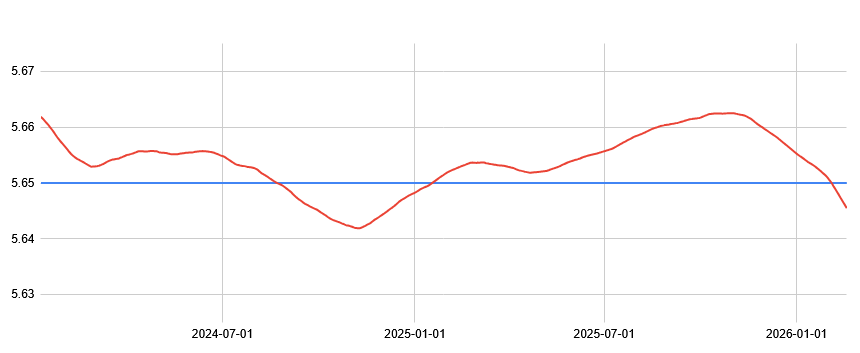 Over a short window, when you zoom in on the charts, you see the exponent oscillate around 5.65, a few hundredths above or below. You see r² move in a narrow band, sometimes crossing above or below its baseline.