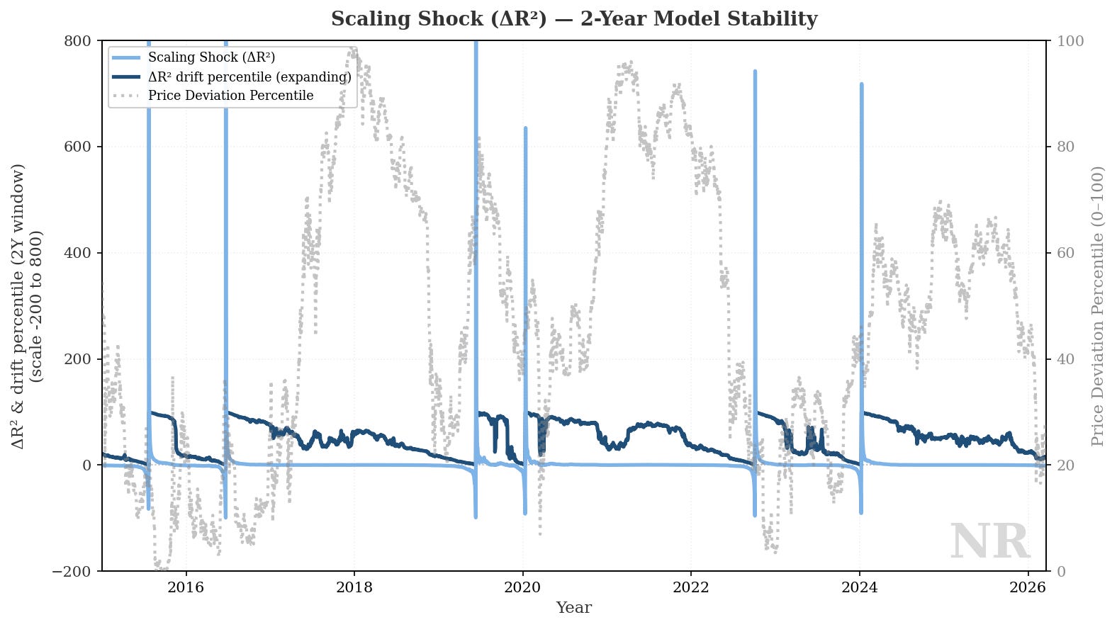 The light blue series we’re calling “Scaling Shock (Δr²). This is the one-day change in rolling 2Y r². When that line spikes, the goodness-of-fit of the two-year window just moved hard.