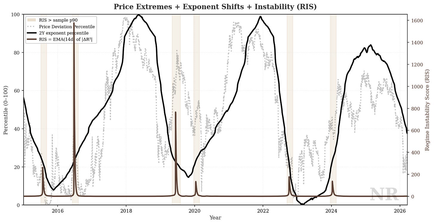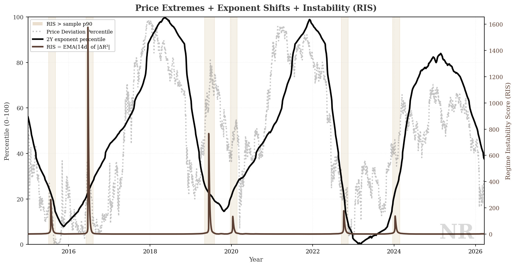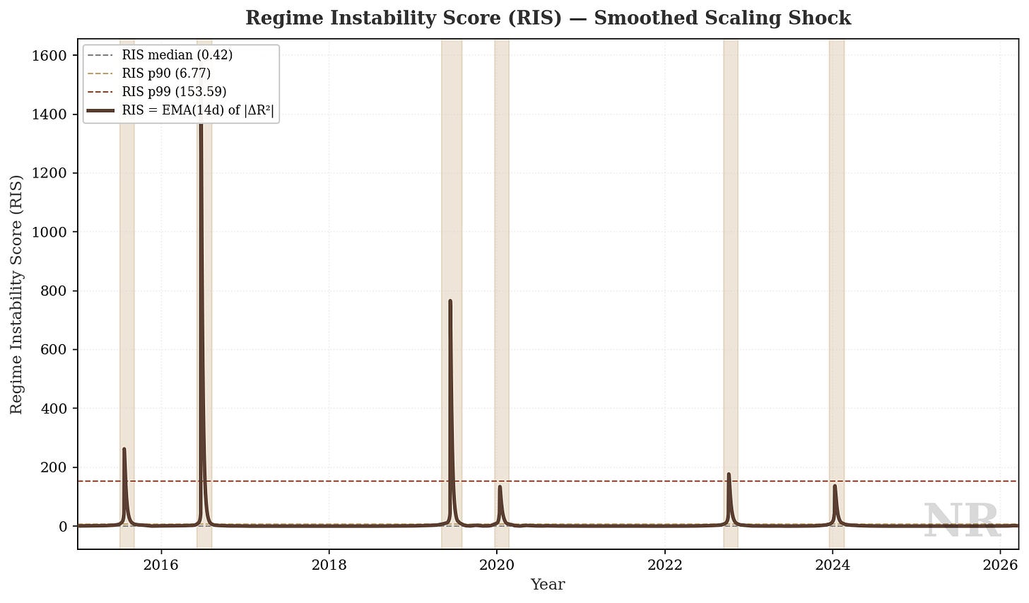 Regime Instability Score (RIS) is the absolute one-day move in 2Y r², with a 14-day span. RIS helps us understand how large have scaling shocks been, and how persistently.
