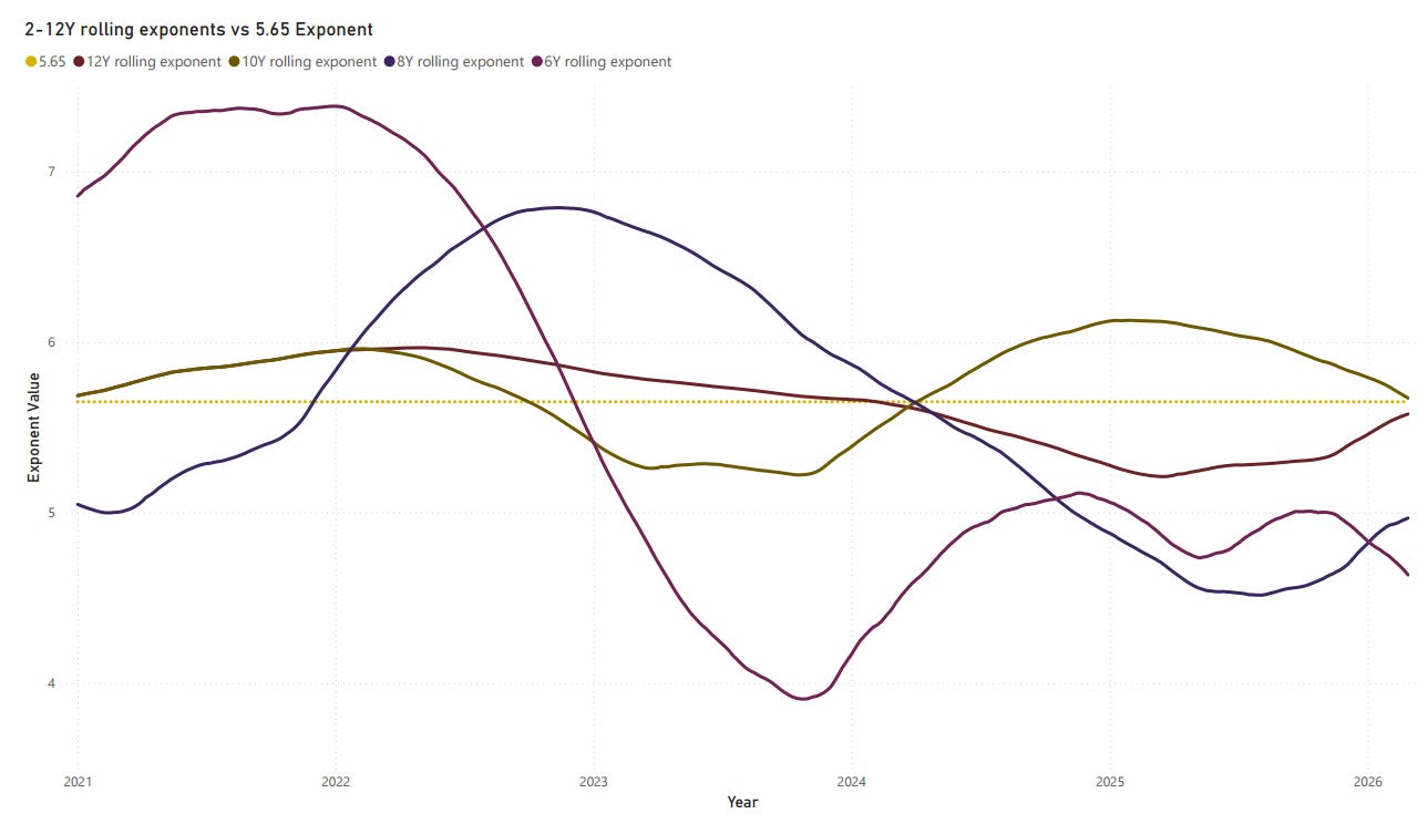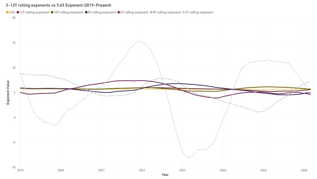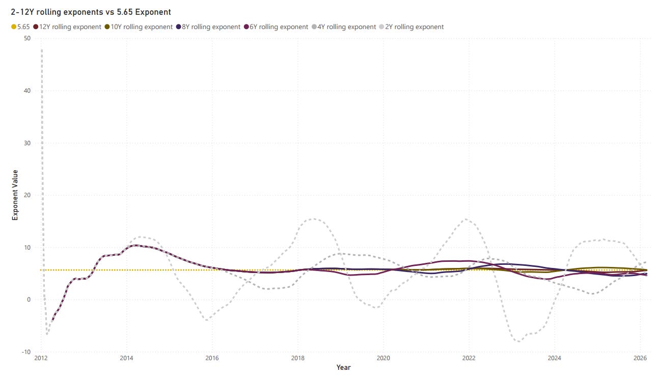 Different timeframes can expose noise versus signal. 2Y and 4Y exponents capture regime and cycle effects. 6Y and longer exponents better approximate the underlying growth rate. This means large deviations of short vs. long exponents (e.g., 6Y well above 5.65 while 12Y is near it) can indicate temporary overheating or stress.